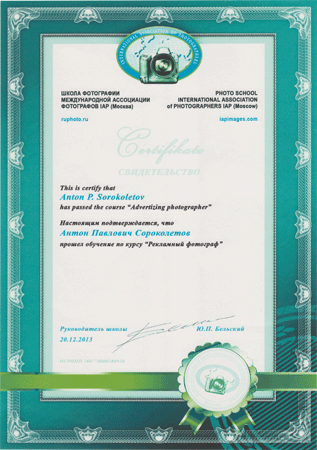 Накопленный опыт позволил мне не только стать сертифицированным рекламным фотографом Международной ассоциации фотографов IAP, но и выполнять заказы для Российского Военно-Исторического общества и Московского Союза Художников.